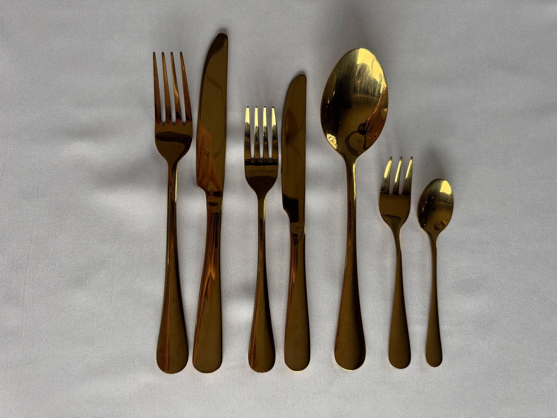 - Goudkleurig bestekset bestaande uit voorgerecht bestek (kleine vork en mes), hoofdgerecht bestek (grote vork, mes en lepel) en dessert bestek (gebaksvorkje en dessertlepel)