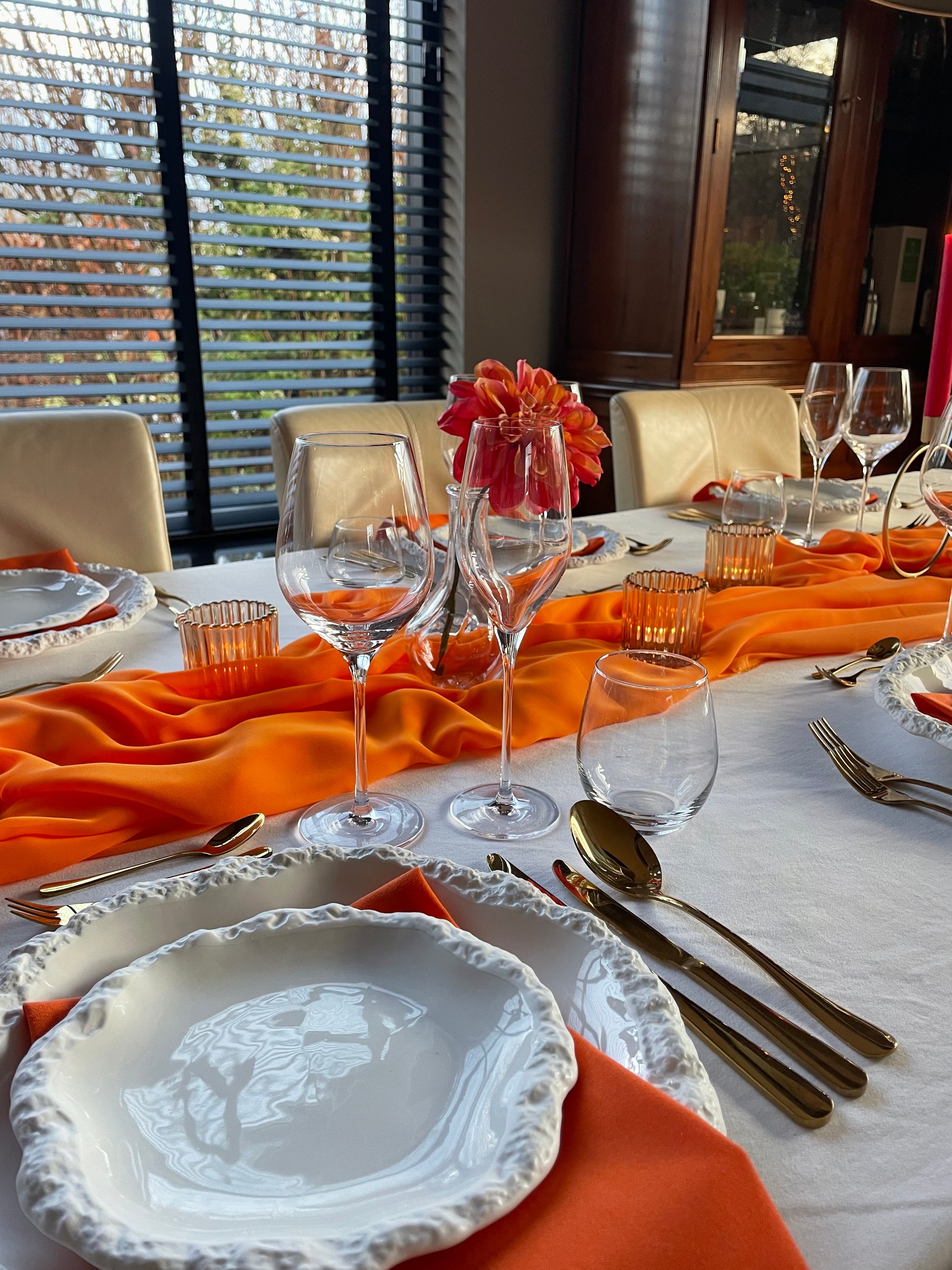 Creëer een betoverende tafelsfeer met het Sunset Soirée-pakket. Dit luxe thema bevat elegante witte porseleinen borden, verfijnde glazen en goudkleurig bestek dat direct een chique uitstraling geeft. De bijpassende tafeldecoratie in warme sunset-tinten – denk aan oranje, rode, roze en gouden accenten – brengt een sfeervolle gloed aan tafel, alsof de zon langzaam ondergaat. Perfect voor diners waarbij stijl, warmte en een vleugje magie centraal staan.